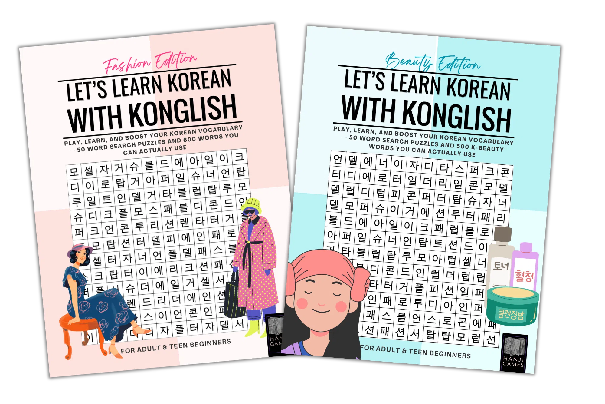 Our Fashion Edition Konglish word search book makes learning Korean fashion vocabulary fun with 50 themed puzzles and 600+ real-world terms.