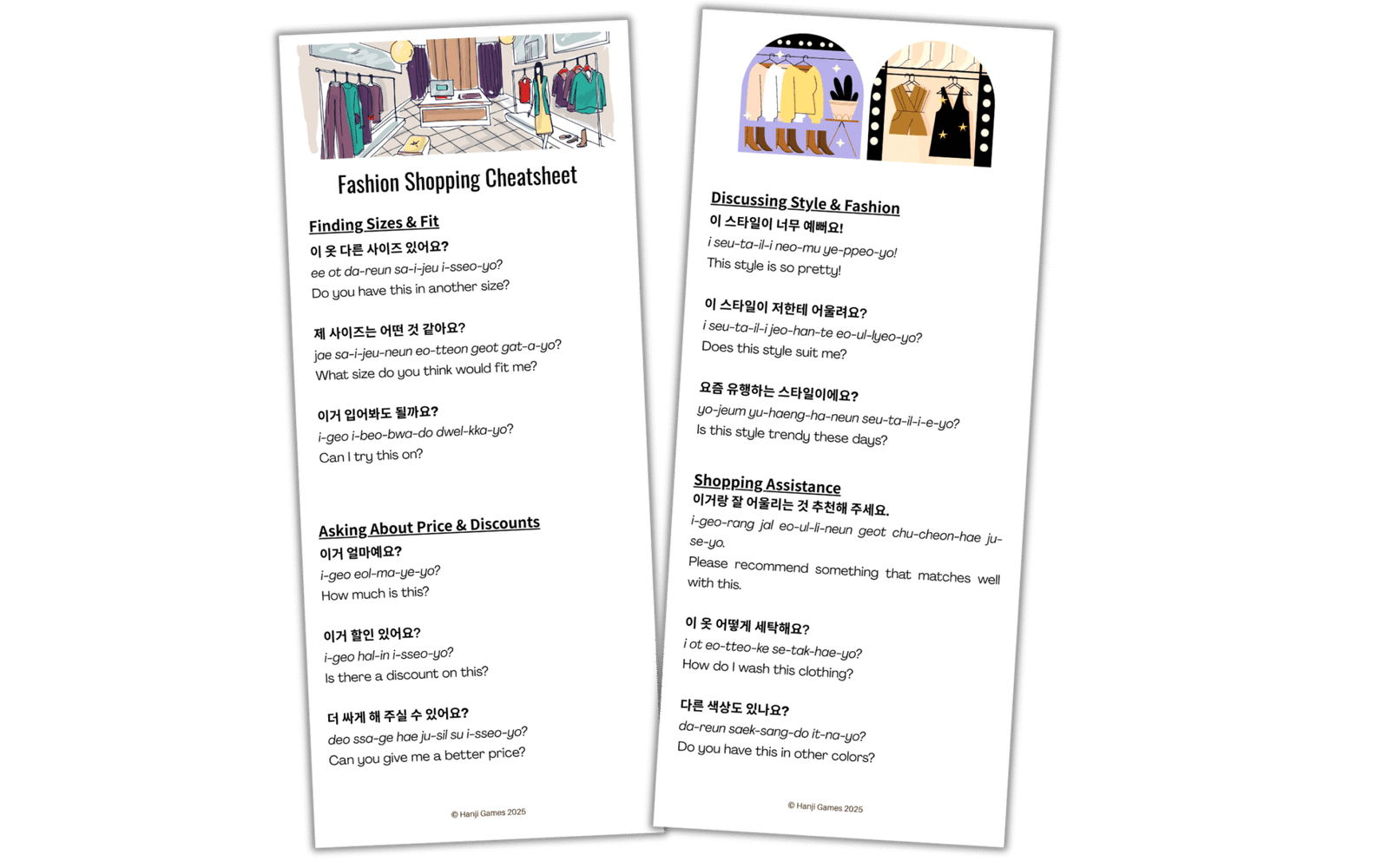 Download the free Korean Fashion Shopping Cheat Sheet that provides practical conversation starters for finding sizes, discussing styles, and asking about discounts in Korean boutiques and online stores.