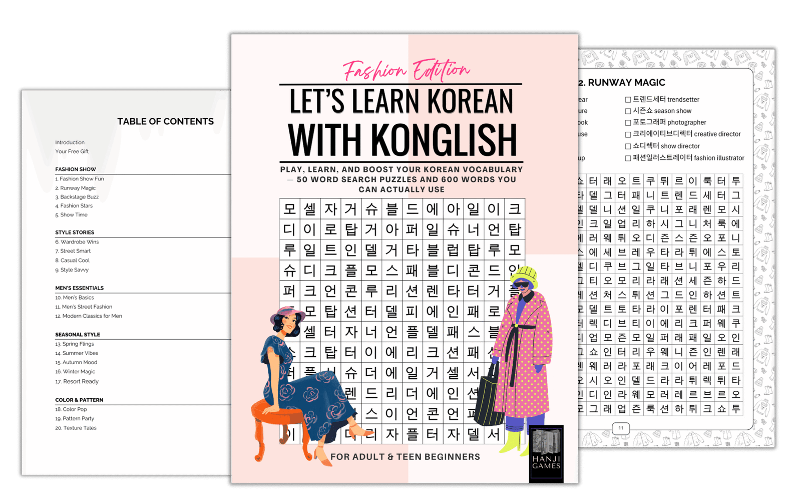 Ever wondered what “스트리트 패션” (street fashion) and “럭셔리 브랜드” (luxury brand) actually mean in Korean fashion culture? This puzzle book reveals how fashion Konglish—familiar English words adapted into Korean—gives you instant access to 600+ fashion terms. From “스커트” (skirt) to “패션위크” (fashion week), discover vocabulary you can recognize and use immediately. Stop struggling with Korean fashion content and start understanding through fun word search puzzles that make learning feel like play.